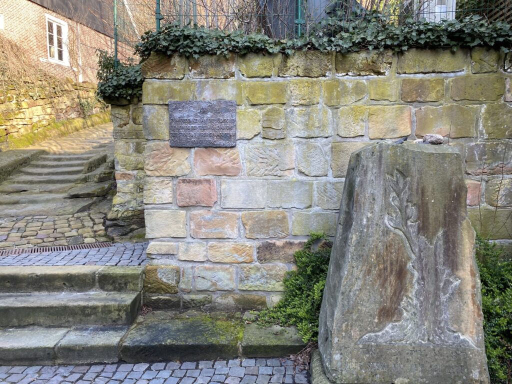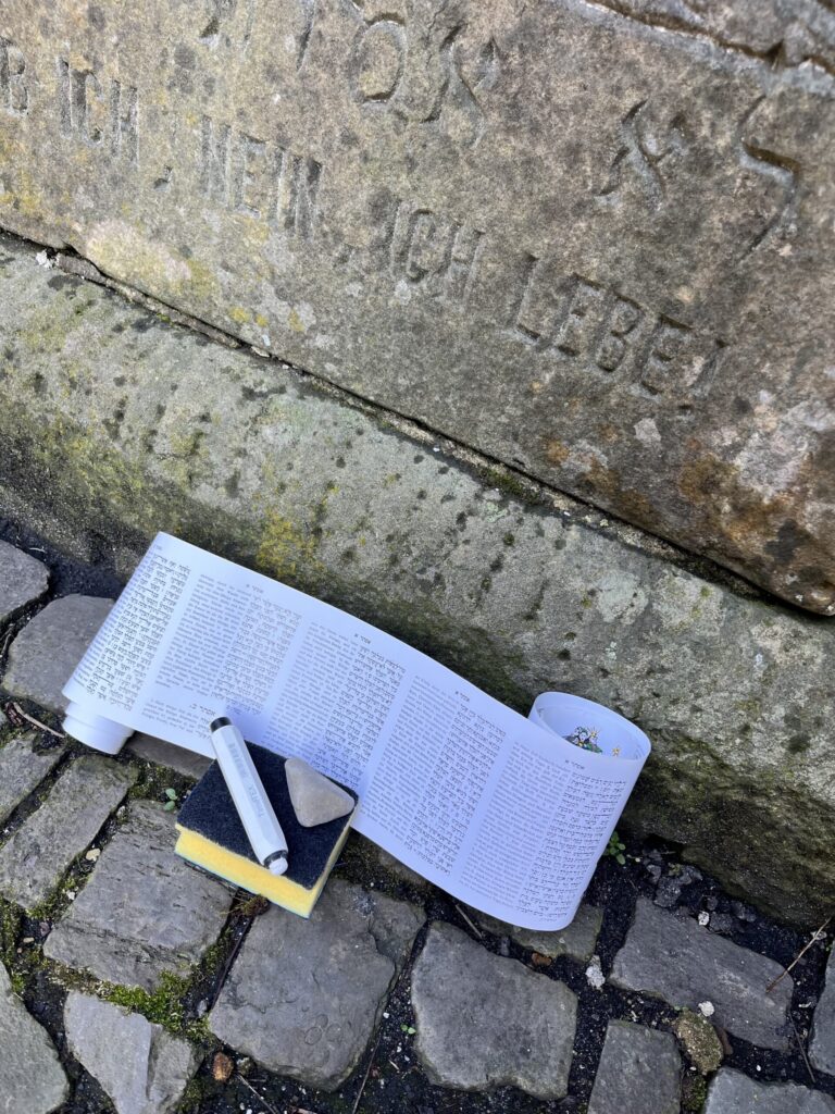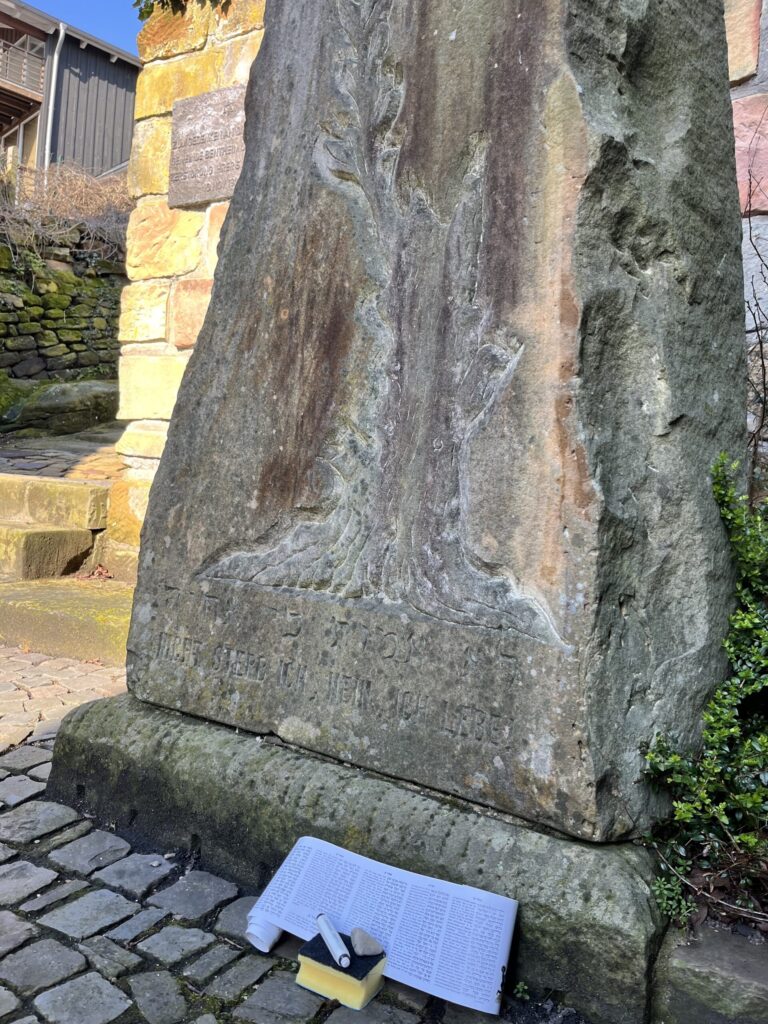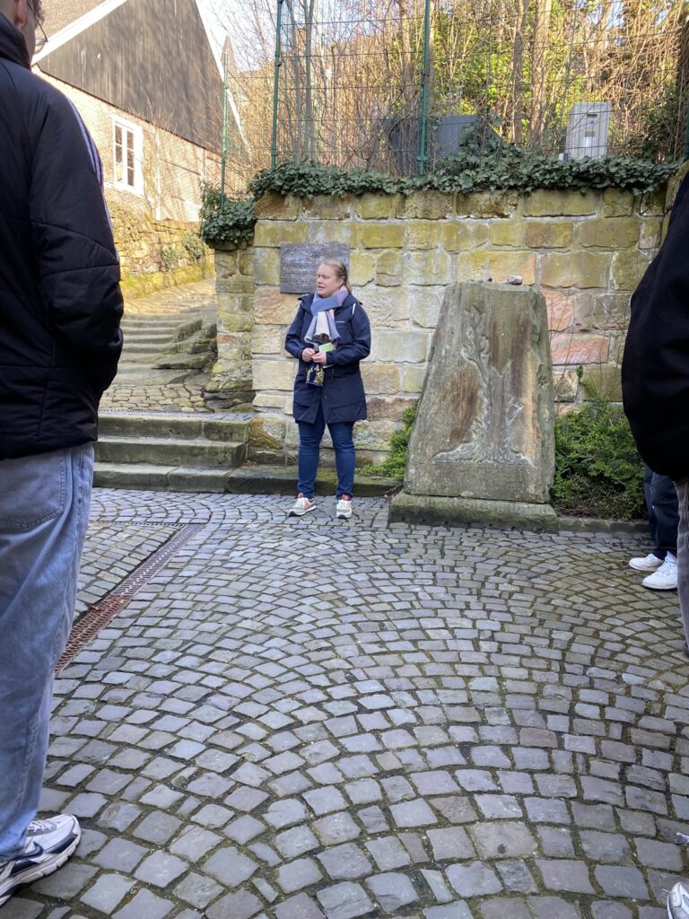 Eine Schriftrolle, ein Stein, ein Putzschwamm und ein Stück Kreide begleiteten am 19. März 2026 die Schülerinnen und Schüler der Klassen 10 kurz vor ihrer Fahrt zur Gedenkstätte Buchenwald über die Wilhelmstraße. Im Laufe der Führung zu den Spuren jüdischen Lebens in Bad Bentheim klärte sich nach und nach, welchen Orten die jeweiligen Gegenstände zuzuordnen waren.