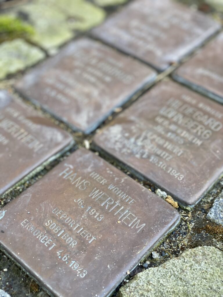 So besuchten die Schülerinnen und Schüler den früheren Standort der Synagoge (Schriftrolle), den Gedenkstein in der Synagogenstiege (Stein), das Haus Wertheim mit den davor liegenden Stolpersteinen (Putzschwamm) und die alte jüdische Schule (Kreide). Dabei erfuhren sie außerdem, wie Jugendliche ihres Alters selbst Opfer der Verfolgung wurden oder im November 1938 aktiv an der Zerstörung der Synagoge mitwirkten.