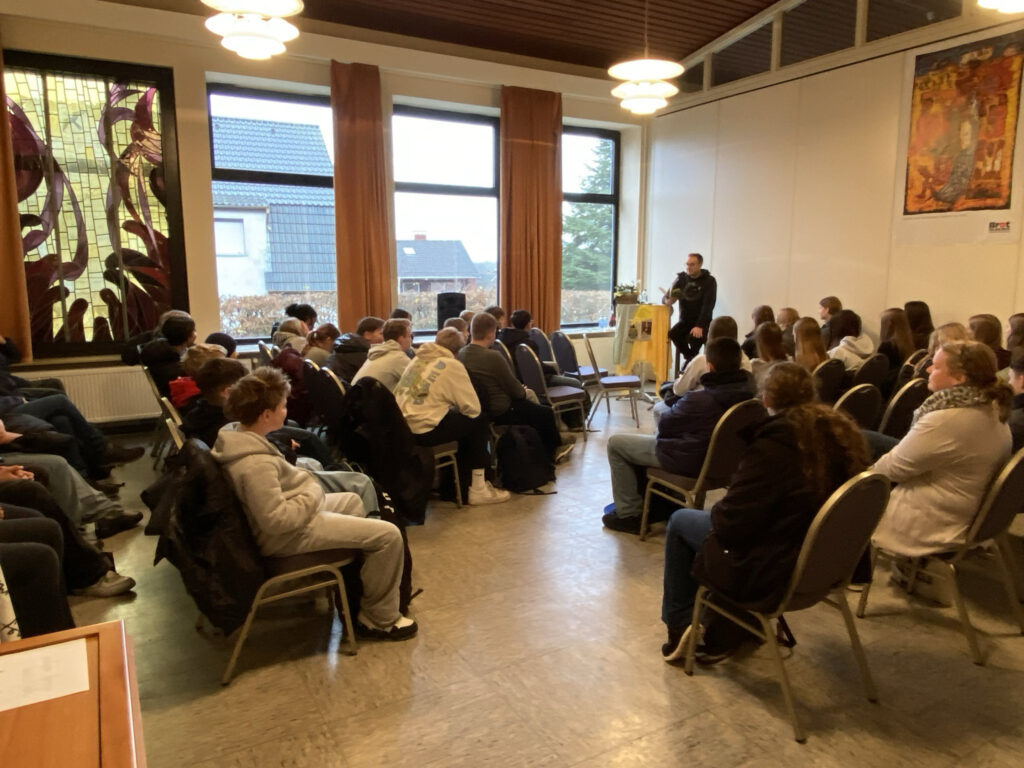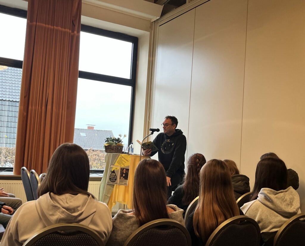 Die Achtklässler lauschten aufmerksam den Passagen des Buches sowie den Erläuterungen des Autors. Dabei nahm Herr Surmann sich viel Zeit für die Fragen der SchülerInnen. So erfuhren sie, wie der Autor den Namen seiner Hauptfigur fand, wie lange er an seinem Buch schrieb und dass ein Autor mehr Geld mit Lesungen verdient als durch den Verkauf der Bücher selbst.