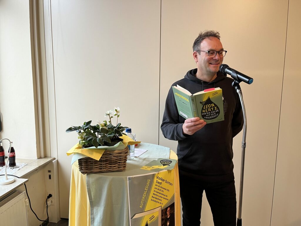 Der Protagonist aus dem Buch „Leon Hertz und die Sache mit der Traurigkeit“, ist der dritte Leon in seiner Klasse, 13 ¾ Jahre alt, heimlich verliebt und wie er selbst sagt „depri light“. Die Geschichte um Leon, aus dem der Autor im Gemeindehaus der ev.-luth. Kirche vorlas, erzählt einfühlsam von Leons Recherchen über ein rätselhaftes Holzkreuz, das Alleinsein und die Freundschaft.