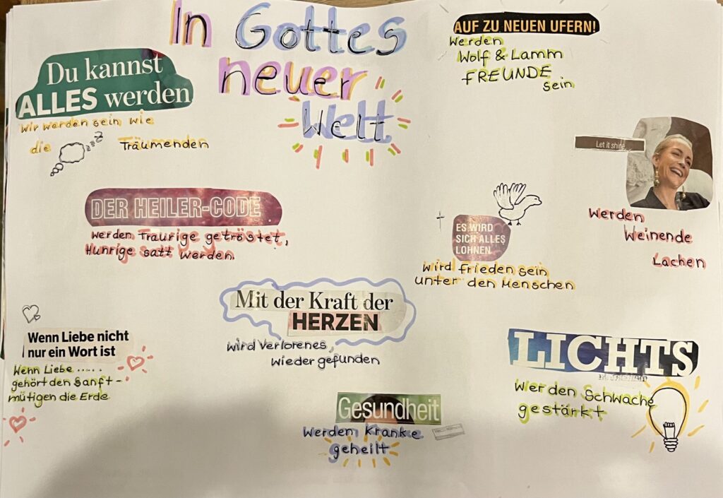 Im Reli­gi­ons­un­ter­richt haben sich die Schü­le­rIn­nen der Klas­sen 9 am 12.12.25 mit dem Thema „Reich Got­tes“ aus­ein­an­der­ge­setzt. In einer krea­ti­ven Auf­gabe setz­ten sie ihre Vor­stel­lun­gen dazu in Form von Col­la­gen um. Mit Bil­dern aus Zeit­schrif­ten und Wor­ten aus der Berg­pre­digt stell­ten sie Werte wie Gerech­tig­keit, Frie­den, Nächs­ten­liebe und Hoff­nung dar.