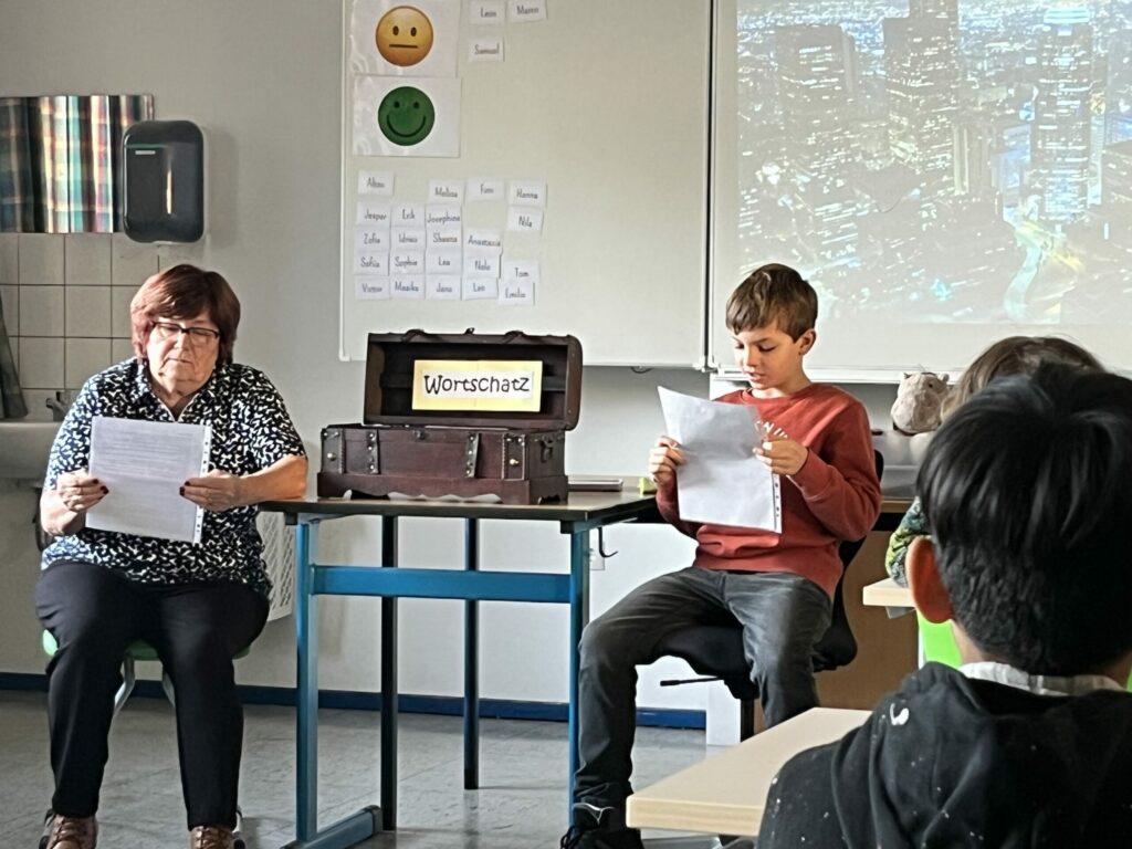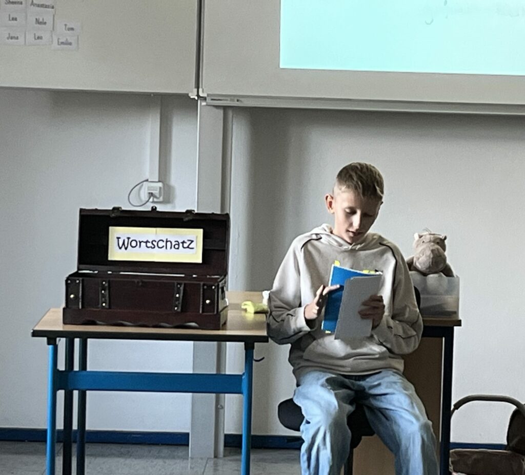 Viele Kinder der Klasse 5b ‑mit Kenntnissen in ganz unterschiedlichen Sprachen- hatten sich bereiterklärt, ihren MitschülerInnen vorzulesen. So hörten sie ein paar plattdeutsche „Weisheiten“ und lauschten Geschichten in russischer, polnischer, moldawisch-rumänischer, deutscher und niederländischer Sprache. Erik las sogar gemeinsam mit seiner Oma ein altes russisches Märchen vor, das sie abwechselnd in deutscher und russischer Sprache vortrugen.